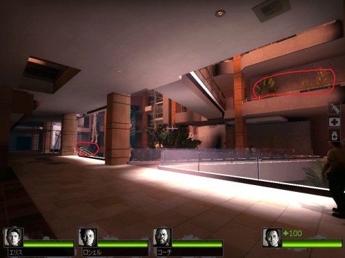 3階ポジションでは、通路から身を乗り出して下に向かって撃つ場面が多いため、そこを Smoker に引かれぶら下がりに陥りやすい。 声のした方向を把握して、声がしたらとりあえず身を引くようにしよう。 通路上は細いために Jockey や Hunter の飛びかかりによるよろけ、Charger による「ストライク」も食らい易い。 特にここでは音に注意しておこう。